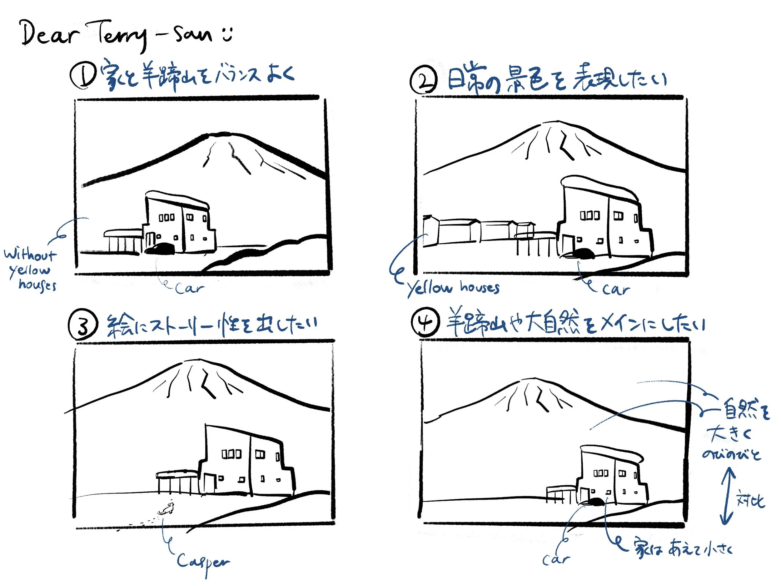 いくつか参考写真をいただき、ラフを①〜④までご提案。
